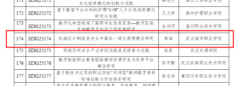 根据《关于公布教育部职业教育发展中心2024年职业教育教研教改课题立项名单的通告》(教职中心〔2025〕31号),我校教师禹诚所申报的《机械设计制造类专业中高本一体化课程建设研究》已正式通过评审,并在立项名单中予以公示。